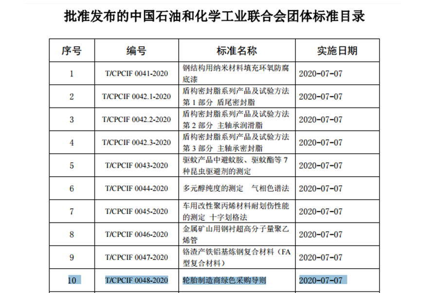 2020年4月7日,中國石油和化學(xué)工業(yè)聯(lián)合會發(fā)布了關(guān)于批準(zhǔn)發(fā)布《鋼結(jié)構(gòu)用納米材料填充環(huán)氧防腐底漆》等15項團體標(biāo)準(zhǔn)的公告(2020年01號)。由我司參與編制的團體標(biāo)準(zhǔn)《輪胎制造商綠色采購導(dǎo)則》(T/CPCIF 0048-2020)...