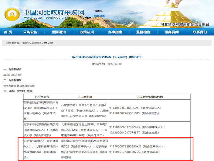 新春新氣象,中標開門紅!隨著春天的腳步走來,全國各地的核查招標工作陸續(xù)開始。2023年3月30日,河北省政府采購網(wǎng)公布了“碳市場建設-碳排放報告核查(5-7標段)”中標公告,科吉與河北省節(jié)能協(xié)會組建的聯(lián)合體成功...
