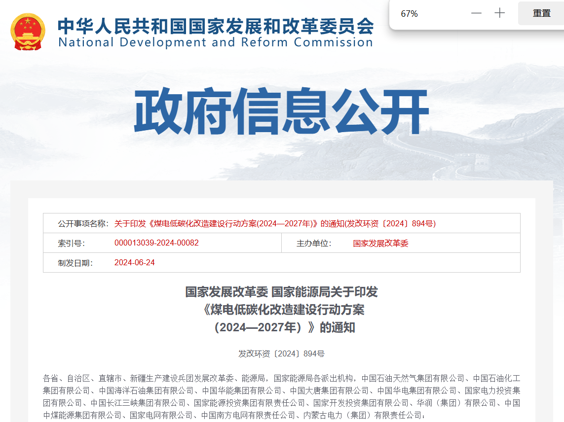 國家發(fā)展改革委 國家能源局關(guān)于印發(fā)《煤電低碳化改造建設(shè)行動方案(2024—2027年)》的通知發(fā)改環(huán)資〔2024〕894號各省、自治區(qū)、直轄市、新疆生產(chǎn)建設(shè)兵團發(fā)展改革委、能源局,國家能源局各派出機構(gòu),中國石油天然氣...