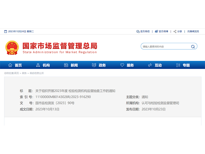 關于組織開展2023年度檢驗檢測機構監(jiān)督抽查工作的通知國市監(jiān)檢測發(fā)〔2023〕90號各省、自治區(qū)、直轄市和新疆生產(chǎn)建設兵團市場監(jiān)管局(廳、委)、公安廳(局)、自然資源廳(委、局)、生態(tài)環(huán)境廳(局)、交通運輸廳(...