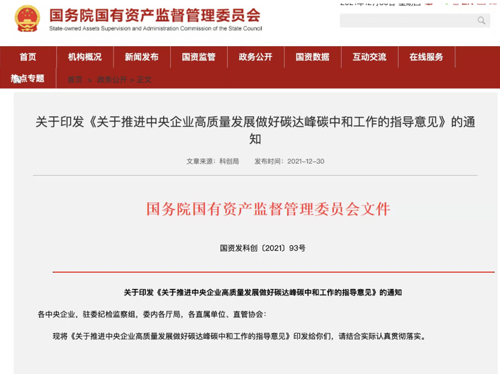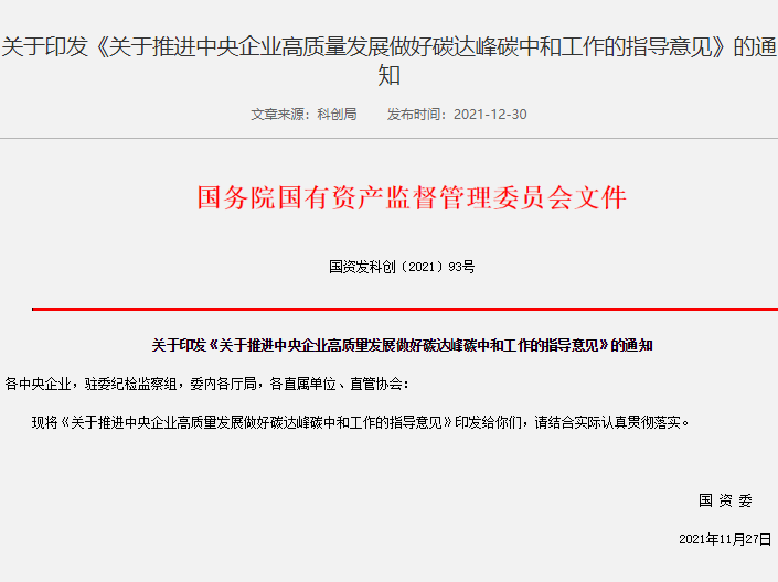 國務(wù)院國資委30日對外發(fā)布《關(guān)于推進中央企業(yè)高質(zhì)量發(fā)展做好碳達峰碳中和工作的指導(dǎo)意見》,明確了中央企業(yè)做好碳達峰碳中和工作的總體要求與主要目標。指導(dǎo)意見明確,要把碳達峰碳中和納入國資央企發(fā)展全局,著力布...