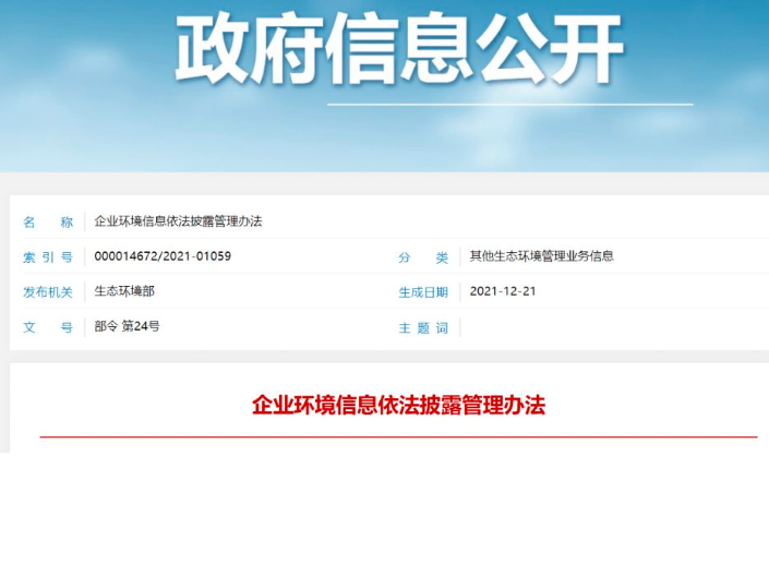 來(lái)源:中國(guó)網(wǎng) 原標(biāo)題:生態(tài)環(huán)境部印發(fā)管理辦法 明確企業(yè)環(huán)境信息依法披露主體與內(nèi)容 中國(guó)網(wǎng)財(cái)經(jīng)12月22日訊 據(jù)生態(tài)環(huán)境部網(wǎng)站消息,為深入推進(jìn)環(huán)境信息依法披露制度改革,日前,生態(tài)環(huán)境部印發(fā)實(shí)施《企業(yè)環(huán)境信...