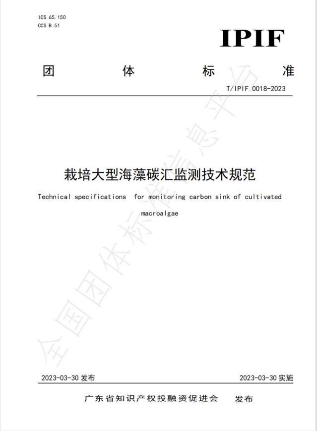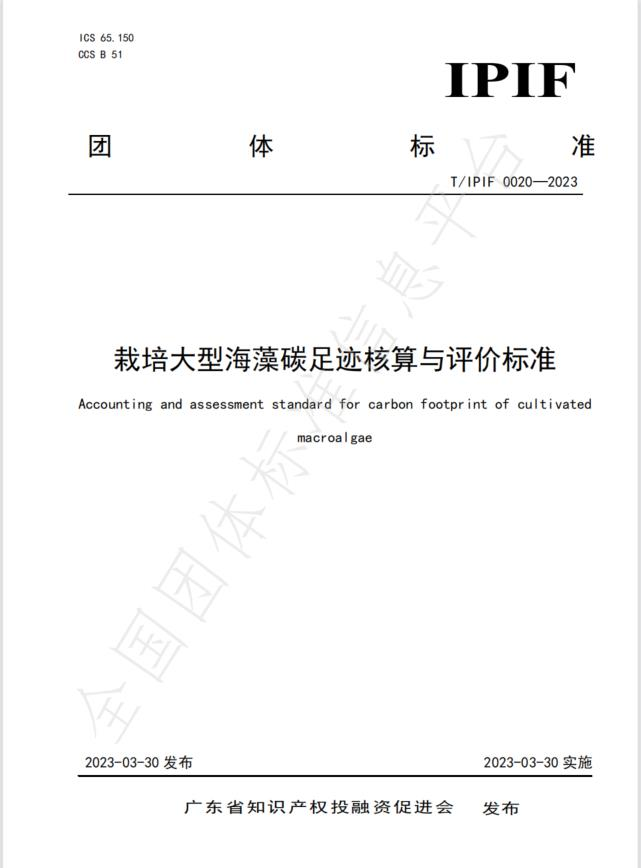廣碳所參與編制的《栽培大型海藻碳足跡核算與評價標準》(T/IPIF 0020-2023)及《栽培大型海藻碳匯監(jiān)測技術(shù)規(guī)范》(T/IPIF 0018-2023)于2023年3月30日在全國團體標準信息平臺正式發(fā)布實施。